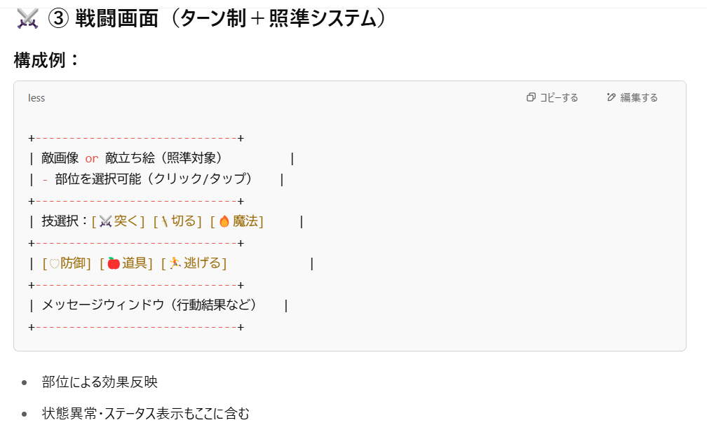 めちゃくちゃ面白いアイデアですね!ドラクエ風のRPGに「部位照準+部位ダメージ効果」の要素を加えると、戦略性がぐっと上がります。
